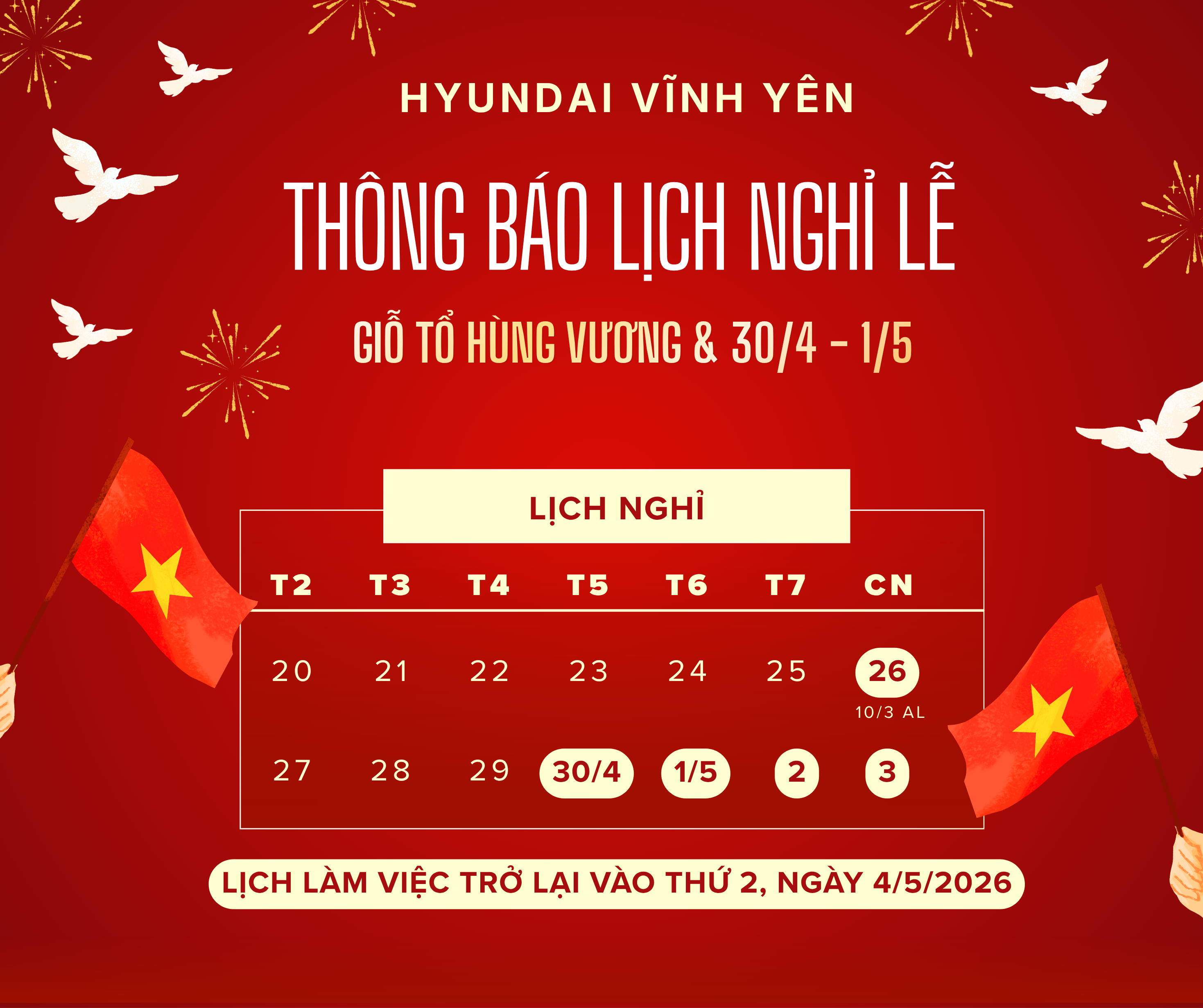Hyundai Vĩnh Yên trân trọng thông báo đến Quý khách hàng, Quý đối tác và CBCNV lịch nghỉ lễ sắp tới như sau: